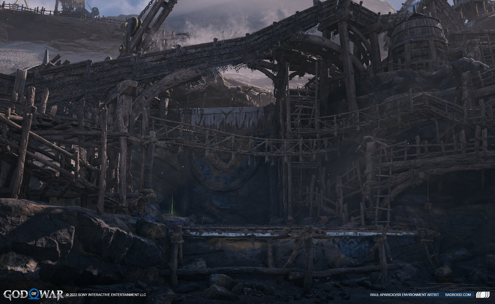 The pitmine is the entrance of the applecore mine which is where Kratos and Atreus heard Tyr might be imprison. It is an example of how dwarves mine the land with all their fancy water towers and cranes! I was the level lead on this area. I worked along side James Ridding and Jon Hickenbottom to iron out the gameplay during artsheet mode. Once i established the look of the mine, Pailin Bartlett and Patrick Ward moved in to create and set dress some of the corners on the map. I created the sculpts for most the rock walls and guided Patrick to develop the ores. He also painstakefully took all the walls to completion after i set up the initial sheet and sculpts.